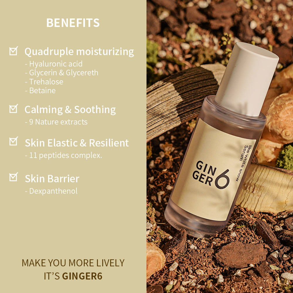 Reveal luminous, healthy-looking skin with GINGER6 Serine Like White Snow, a brightening and calming essence designed to even out skin tone and restore your natural radiance. Infused with Ginger6™ extract, this lightweight yet potent formula delivers powerful antioxidant benefits, helping to protect the skin from environmental stressors while boosting hydration and vitality.